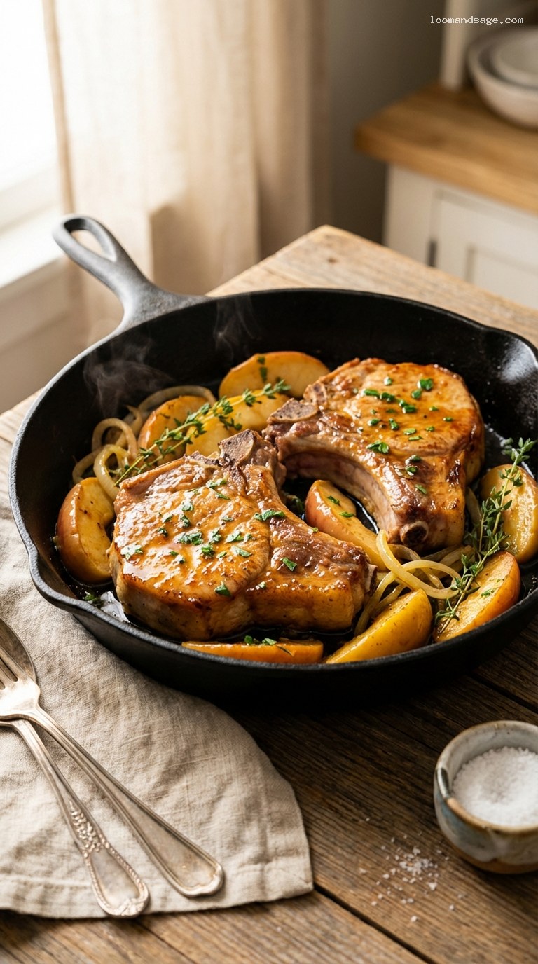 • Smoky bacon twist: Cook 3–4 slices chopped bacon in the skillet first. Remove and use the drippings to sear the chops. Stir the crisp bacon back into the apples and onions before braising.