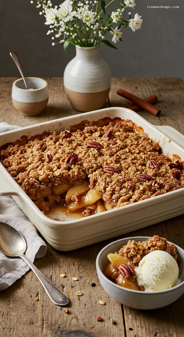 - Pantry: Old-fashioned rolled oats, pecans, all-purpose flour, light brown sugar, granulated sugar, ground cinnamon, ground nutmeg, fine salt, apple cider