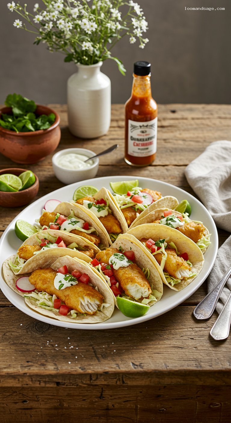 Layer warm tortillas with a handful of shredded cabbage, 1–2 crispy fish pieces, a generous spoonful of pico de gallo, and a drizzle of the creamy lime sauce. Finish with a few drops of hot sauce and a squeeze of lime. Serve immediately while the fish is at peak crispness.