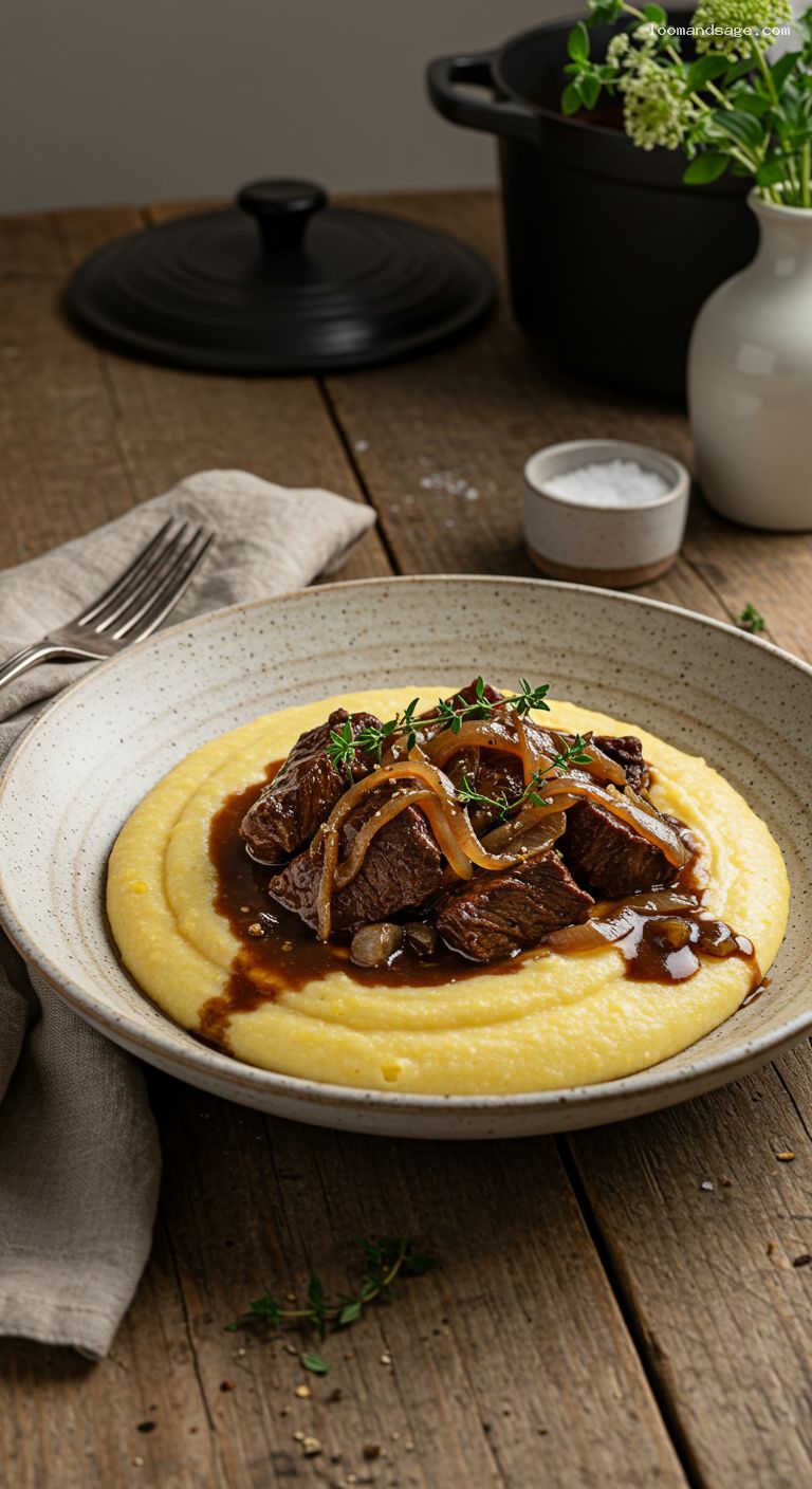 Spoon a generous bed of soft Parmesan polenta into warm bowls. Top with the braised beef and a tangle of balsamic-onions. Ladle on the reduced sauce. Garnish with fresh thyme leaves, a crack of black pepper, and a pinch of flaky salt if you like. Serve hot.