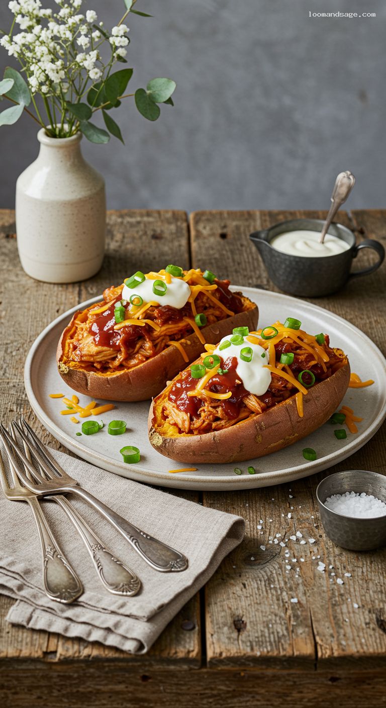 Roast the sweet potatoes and make the BBQ chicken up to 4 days ahead; store separately, covered, in the refrigerator. Reheat potatoes at 350°F (177°C) for 15–20 minutes or microwave 2–3 minutes. Warm chicken on the stovetop with a splash of water. Assemble, add cheese, and broil to serve. The BBQ chicken freezes well (up to 3 months); thaw overnight in the fridge. Add ranch and scallions only at serving so everything tastes fresh.