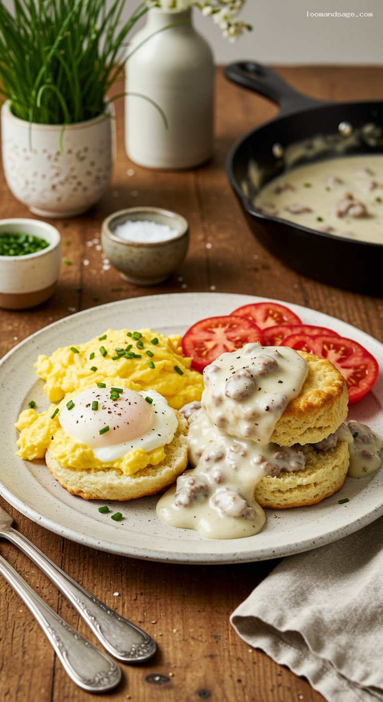 Slice the tomatoes and drizzle with 1 teaspoon olive oil; sprinkle with a pinch of salt and pepper. Split warm biscuits, spoon sausage gravy generously over the tops, and add a side of soft-scrambled eggs and seasoned tomato slices. Finish with chopped chives or parsley and a final crack of black pepper. Serve immediately.