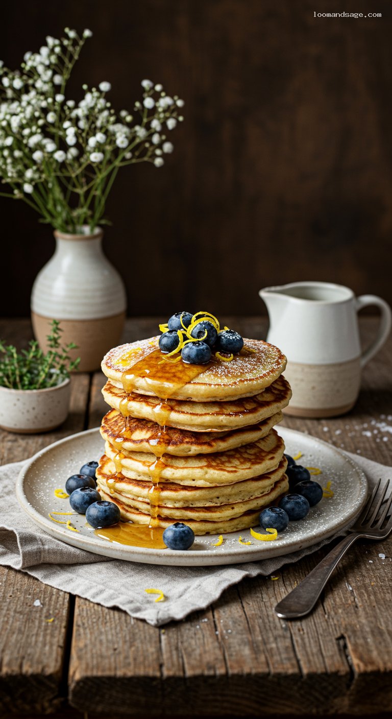 - Fluffy, tender pancakes with bright lemon zest and juicy bursts of blueberry in every bite.