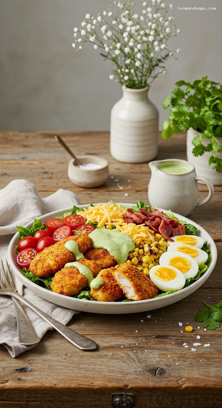 Divide greens among 4 wide bowls. Neatly arrange warm nuggets (breaded or grilled), charred corn, grape tomatoes, cheddar-jack, bacon, and sliced egg across the top. Drizzle generously with avocado-lime ranch and garnish with chives or green onion if using. Serve immediately while chicken is warm and bacon is crisp.