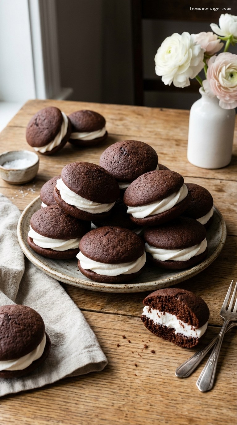Store assembled whoopie pies in an airtight container in the refrigerator for up to 4 days. For the best texture, let them sit at room temperature for 10–15 minutes before serving so the cakes soften slightly and the filling becomes cloudlike again.