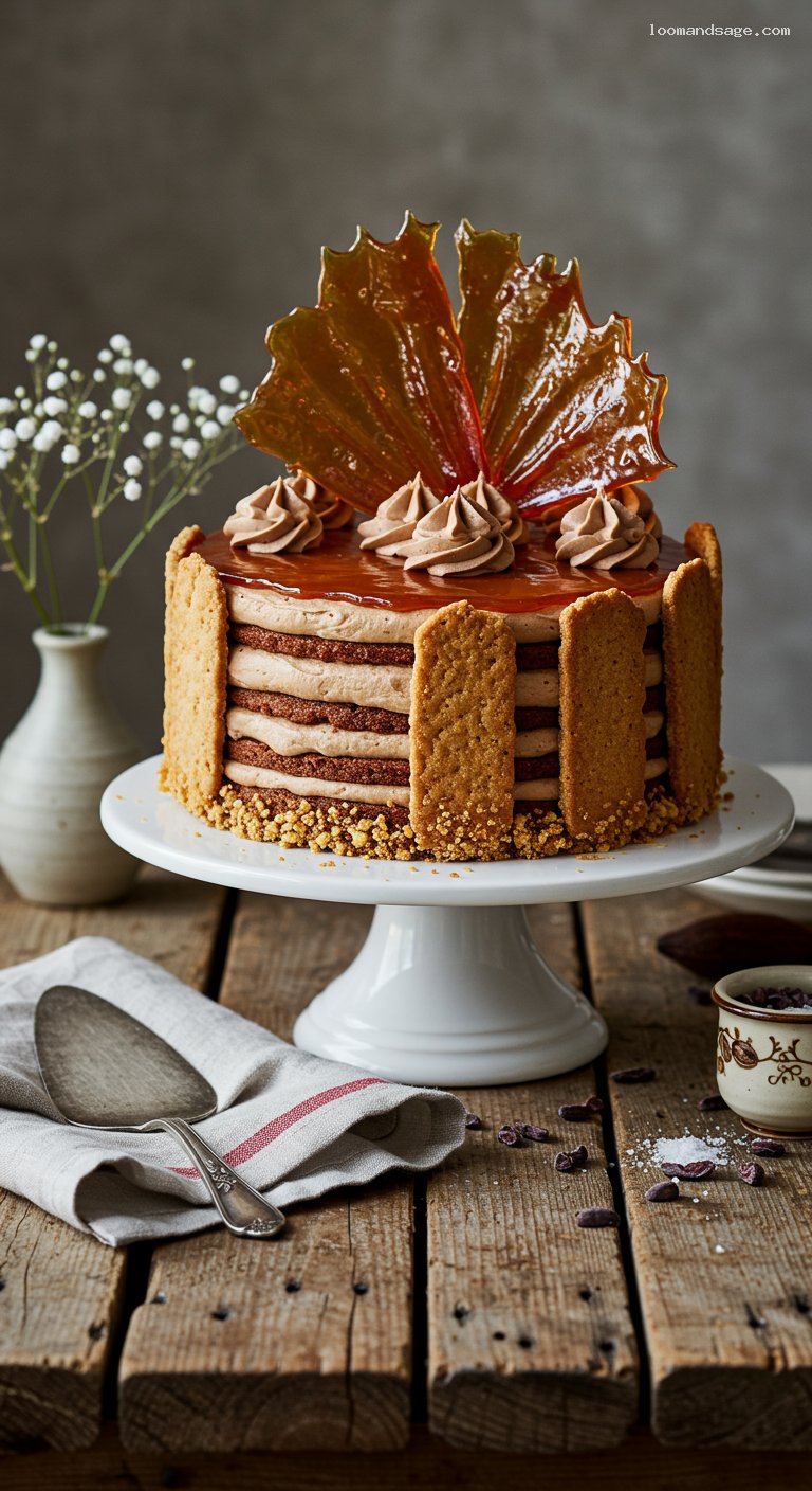- 7) Assemble: stack 5–6 layers with 1/2 cup buttercream each; crumb-coat and chill. Finish with smooth coat, press wafers around sides, pipe rosettes, arrange caramel wedges in a fan. Chill 1 hour before slicing.