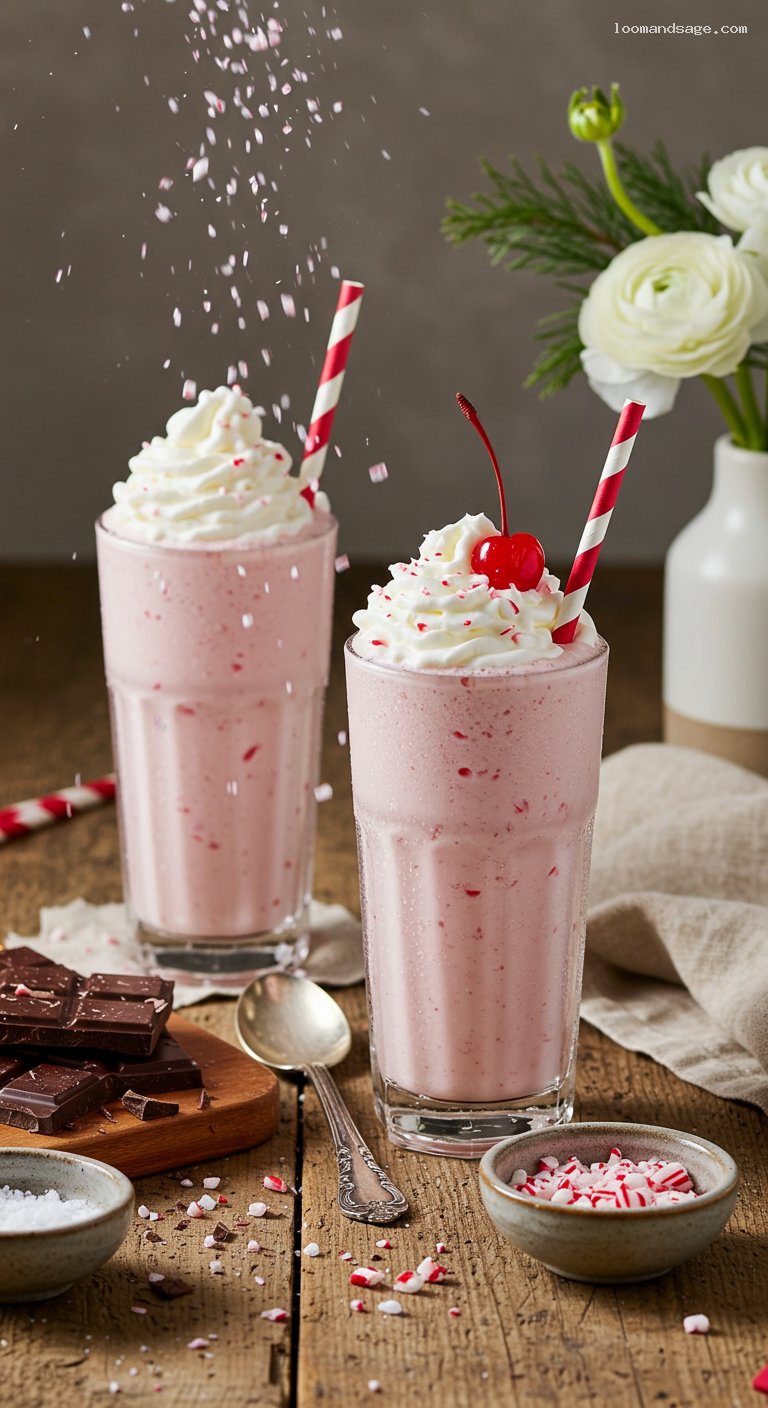 Pour into the chilled glasses. Top each with a generous swirl of whipped cream and a maraschino cherry. Finish with a pinch of crushed peppermint for a festive look.