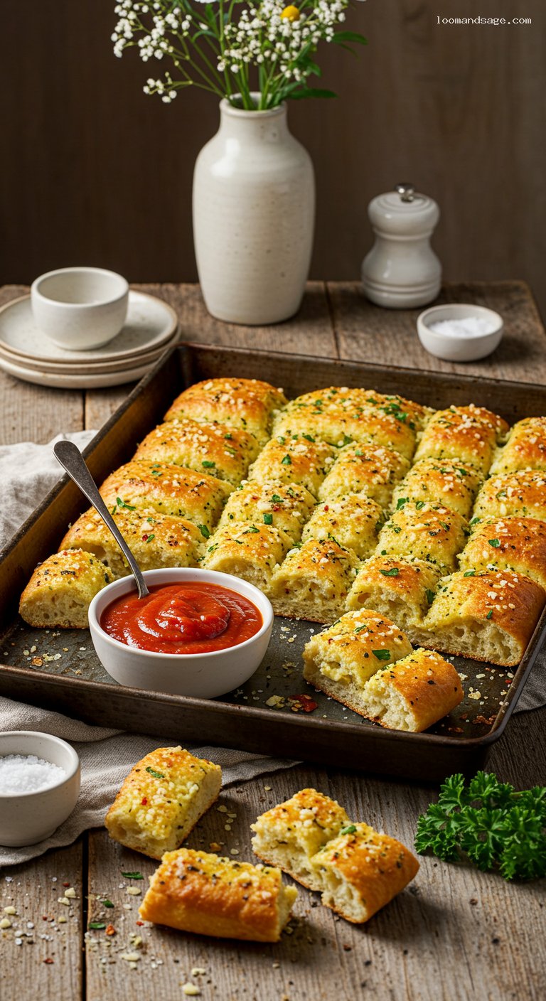 In a small bowl, mix the breadstick seasoning ingredients. For the sauce, warm 1 tbsp olive oil in a saucepan over medium heat. Add minced garlic and cook 30 seconds. Stir in tomato sauce, crushed tomatoes, oregano, basil, sugar, and red pepper flakes. Simmer gently for 10 minutes, stirring occasionally. Off heat, stir in red wine vinegar and salt to taste; keep warm.