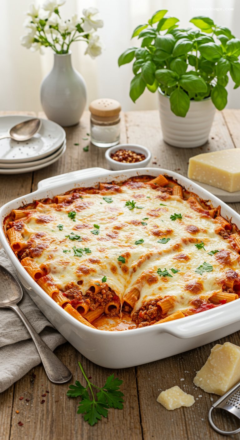 Let the pasta rest 5–10 minutes so it sets and slices cleanly. Sprinkle with chopped parsley and serve hot. Pass extra Parmesan and red pepper flakes at the table.