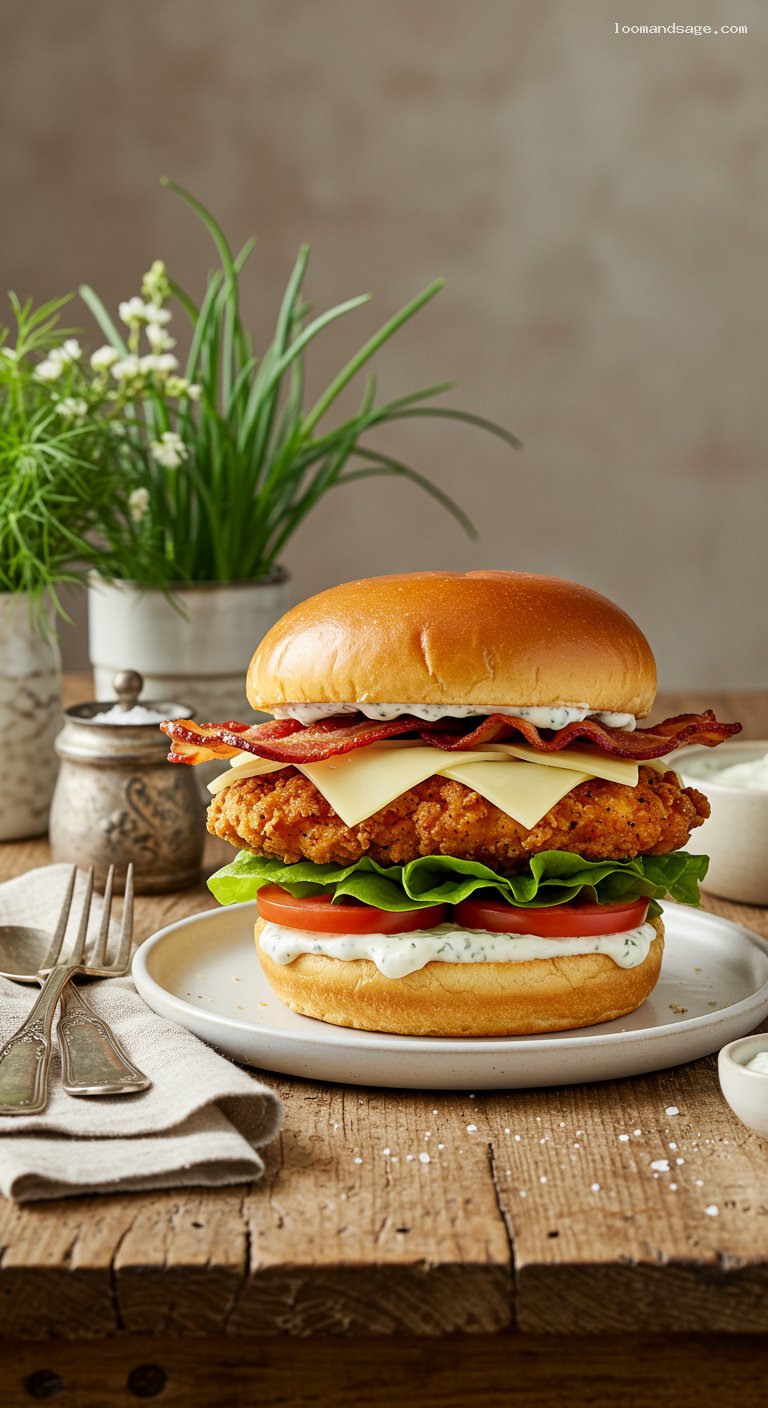 Store components separately. Ranch keeps 5 days in the fridge. Cook bacon up to 3 days ahead; re-crisp in a 375°F oven for 5 minutes. For crispy chicken, bread cutlets and freeze on a sheet until solid, then bag for up to 1 month; fry from frozen at 325–340°F for 5–6 minutes per side (to 165°F). Cooked chicken stores 3–4 days; reheat crispy pieces in a 375°F air fryer or oven for 6–8 minutes. Assemble sandwiches just before serving for best texture.