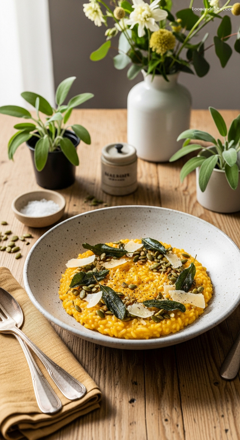 • Layered textures: silky rice, crisp sage, and crunchy toasted pepitas.
