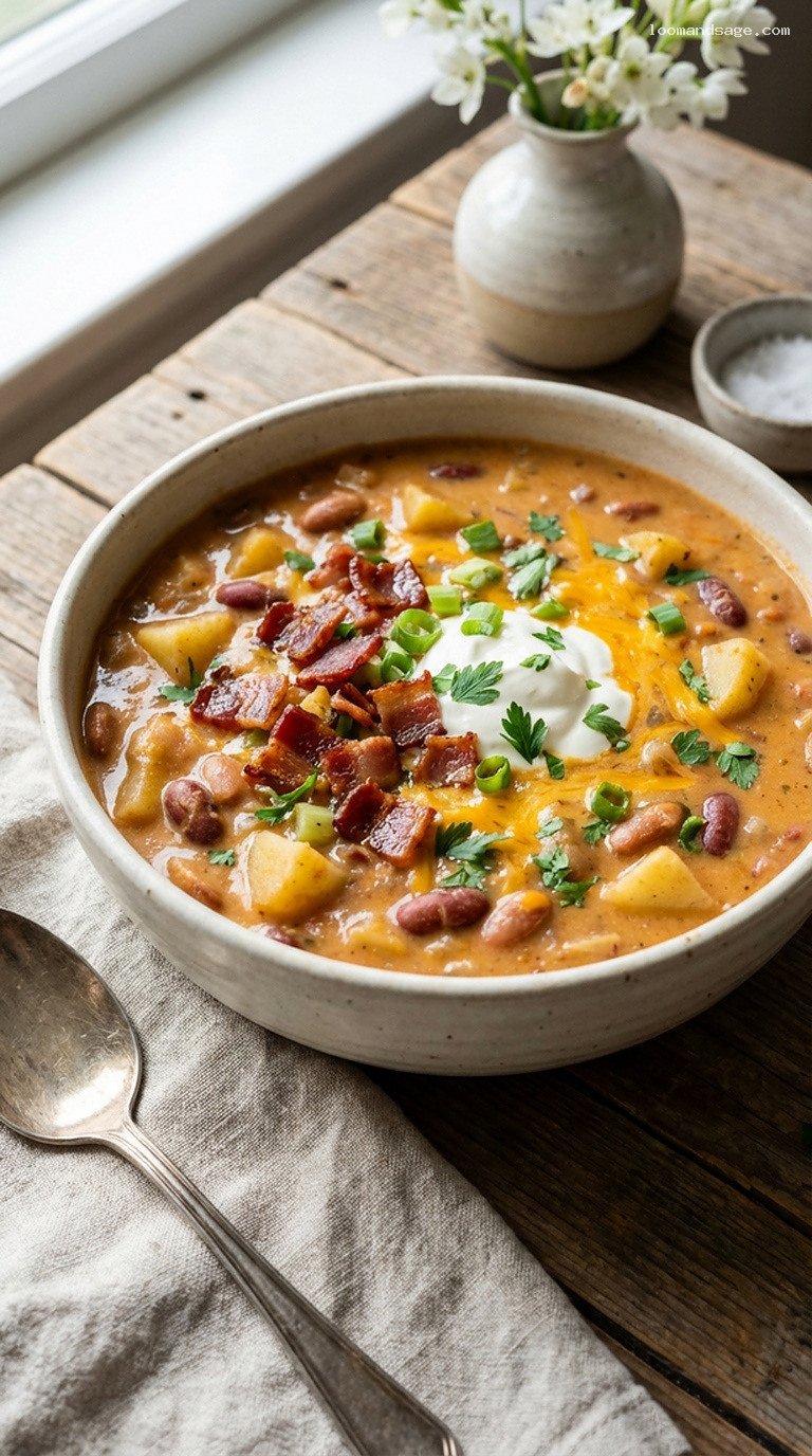 Remove and discard the bay leaf. Ladle the buttery potato and bacon chili into warm bowls. Top each serving with a sprinkle of shredded sharp cheddar, a spoonful of sour cream, the reserved crispy bacon, and a shower of sliced green onions and fresh herbs. Serve hot with tortilla chips, crackers, or crusty bread for dipping. The texture should be thick and chowder-like, with creamy potatoes, tender beans, and little pops of smoky bacon in every bite.