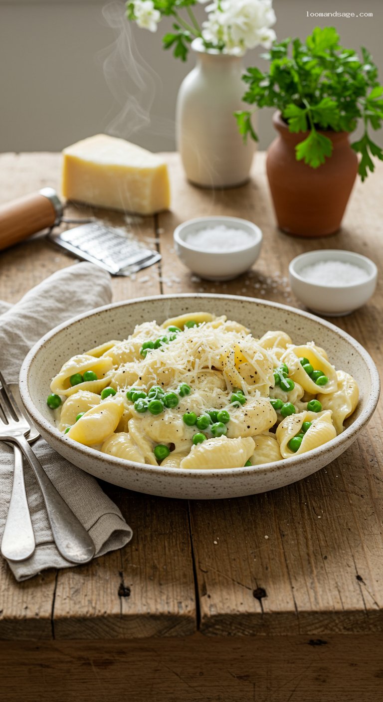 Return the drained pasta and peas to the pot over low heat. Pour in the hot cottage-cheese sauce and toss vigorously for 1–2 minutes until every shell is coated and the sauce clings. If the sauce seems tight, splash in more hot pasta water 1–2 tablespoons at a time until silky.