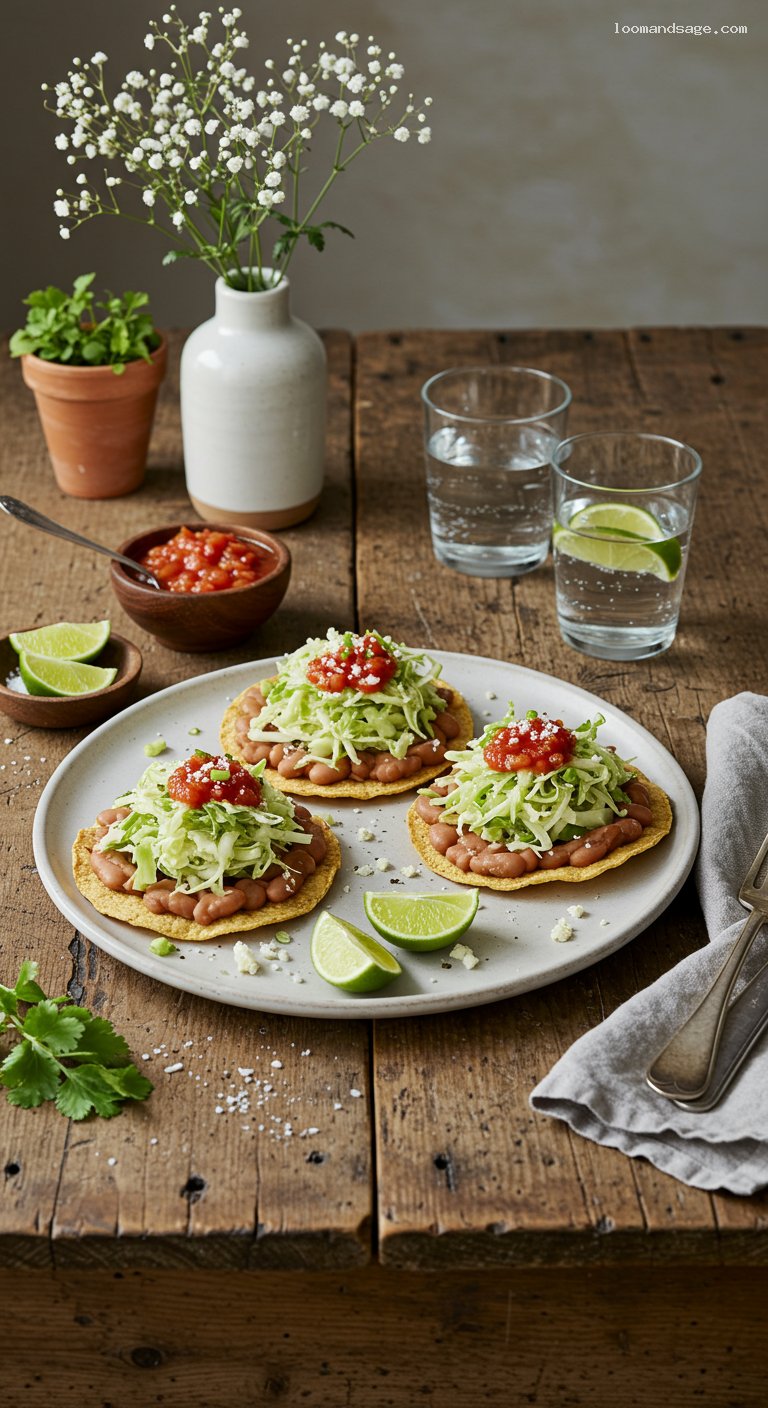 Arrange tostadas on a platter. Add lime wedges and a bottle of hot sauce to the table. Serve immediately while the shells are shatter-crisp and the beans are warm.