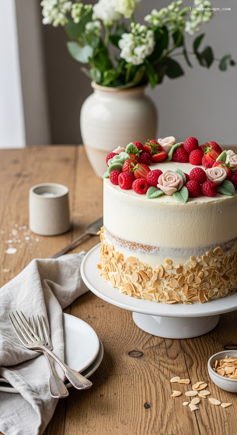 - 6. Layer cakes with buttercream. Crumb-coat, chill briefly, then frost smoothly. Decorate with sliced almonds, marzipan, and fresh berries.