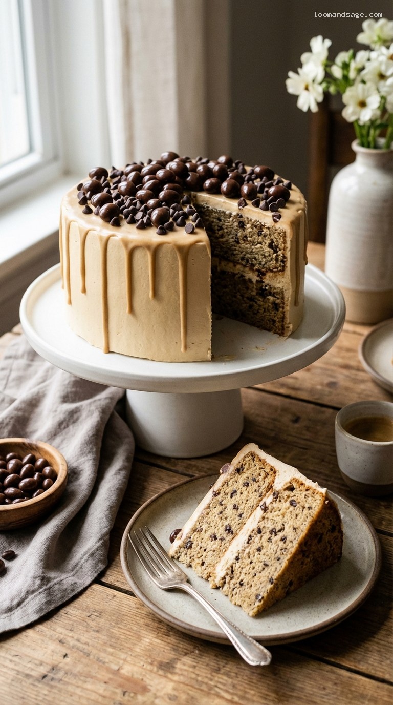 Give the coffee glaze a quick stir, then pour it onto the center of the chilled cake. Use the back of a spoon to gently nudge the glaze toward the edges, letting it drip down the sides in soft drips. While the glaze is still tacky, decorate the top with chocolate-covered espresso beans and a scattering of mini chocolate chips. Let the glaze set for at least 15–20 minutes before slicing for the neatest slices.