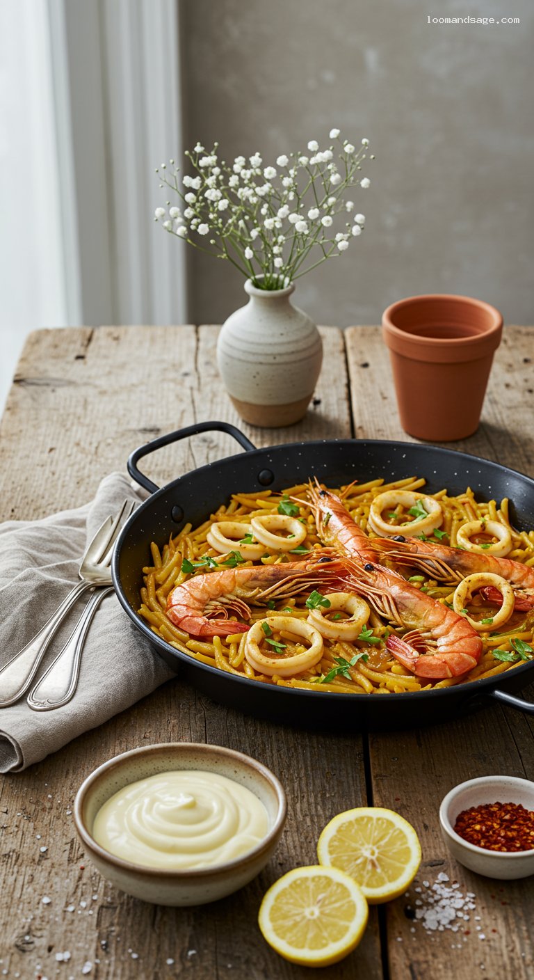 Fideuà de Gandía with Squid, Prawns, and Alioli