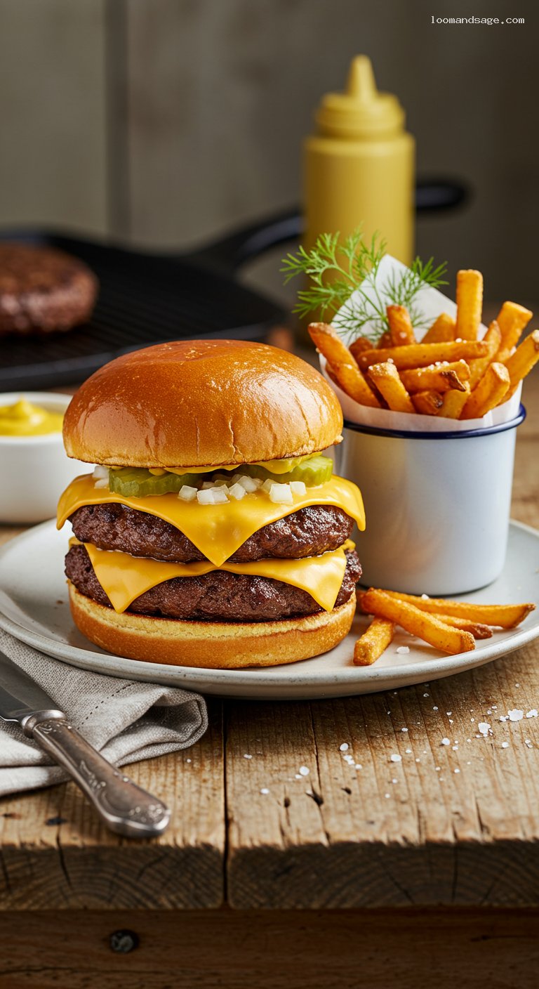 These burgers are best eaten immediately; the crispy edges soften as they sit. You can portion beef balls up to 24 hours in advance and refrigerate tightly covered. Dice onions and slice pickles up to 2 days ahead. Butter the buns and keep covered at room temperature for up to 8 hours. For fries, cut and keep in cold water up to 8 hours; dry thoroughly before frying. Reheating burgers will not recreate the original texture, but you can re-crisp patties in a hot skillet for 45–60 seconds per side and re-toast the buns.