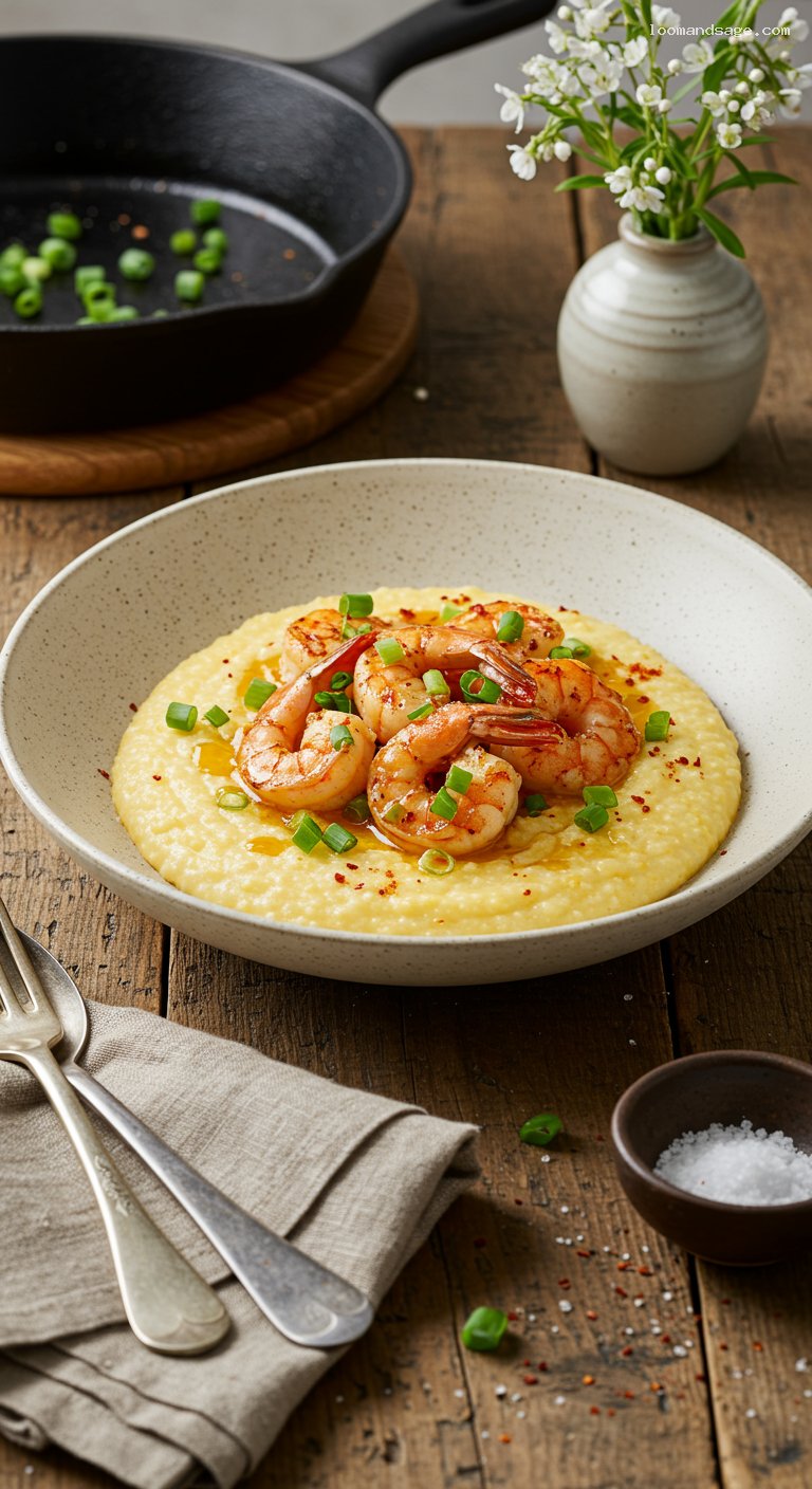 Refrigerate leftovers in separate airtight containers: grits up to 4 days, shrimp up to 2 days. Reheat grits gently on the stovetop with 2–4 tbsp hot stock or milk per serving, whisking until creamy. Rewarm shrimp briefly in a skillet over low heat with a splash of stock or water just until heated through; avoid overcooking. Make-ahead tips: shred cheese, slice scallions, and mix the shrimp spice blend up to 2 days in advance. Grits can be cooked a day ahead; reheat with extra liquid and finish with a fresh pat of butter to bring back the gloss.