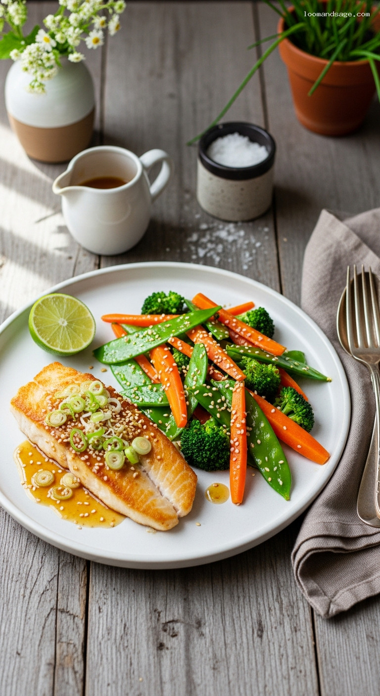 Glaze can be made up to 3 days ahead; refrigerate and rewarm gently with a splash of water. Store leftovers (fish and veggies separately) in airtight containers up to 2 days. Reheat fish covered in a low oven at 275°F for 8–10 minutes or gently in a skillet with a bit of water. Veggies reheat well in a hot skillet in 2–3 minutes. Freezing is not recommended for best texture.