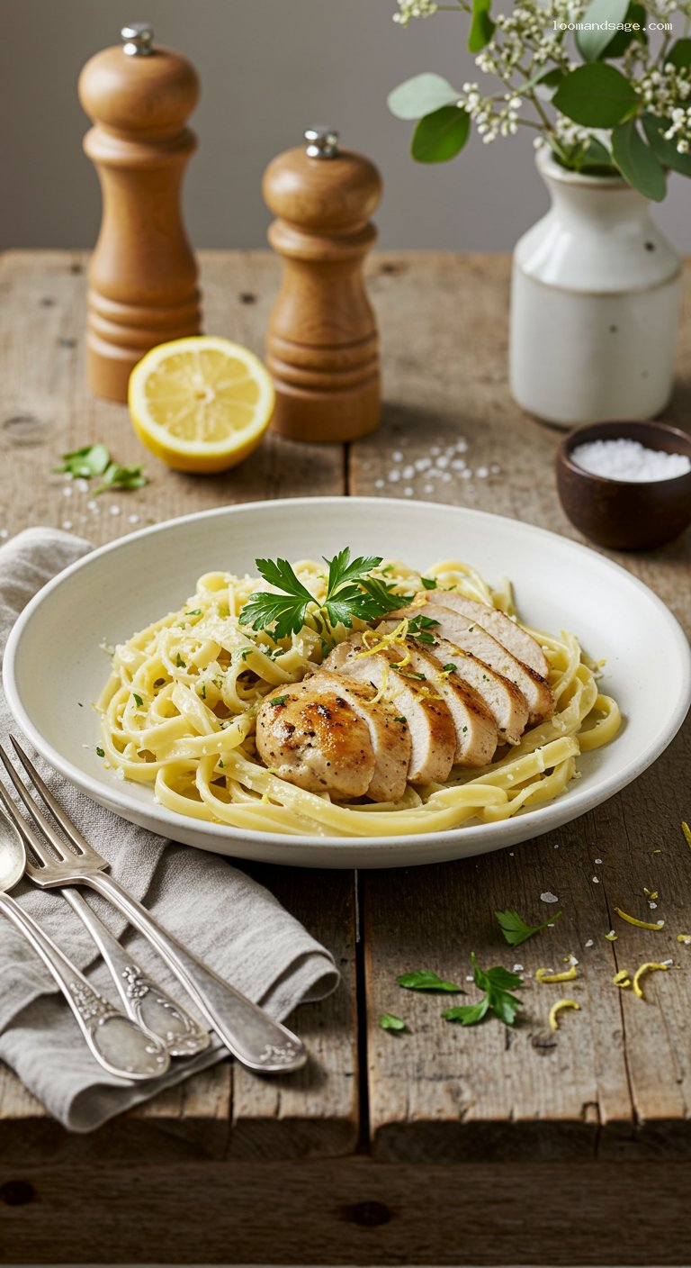 Stir in lemon zest, lemon juice, and parsley. Taste and adjust salt and pepper. Plate the pasta in warm bowls, top with sliced chicken, and finish with extra Parmesan and a crack of black pepper. Serve immediately.