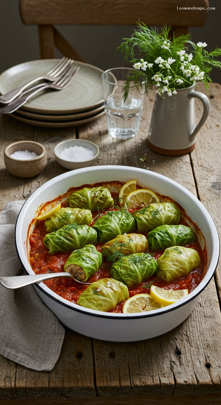 Remove the foil and bake 10–15 minutes more to concentrate the sauce and lightly color the tops. For food safety, ensure the center of a roll registers at least 160°F (71°C). Rest 10 minutes so the juices settle. Taste the sauce; brighten with a squeeze of lemon if desired. Garnish with chopped dill and parsley. Serve warm, with a spoonful of sour cream if you like.