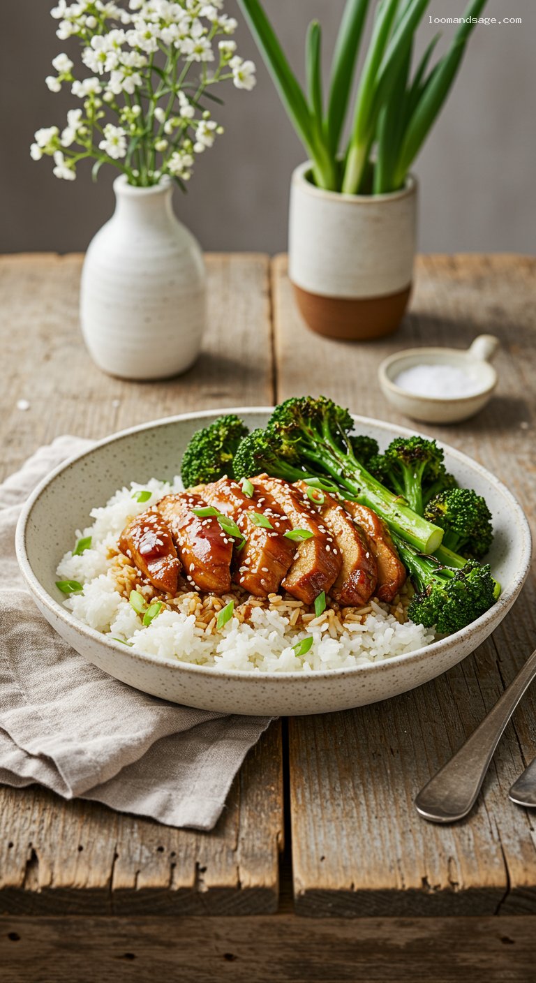 - 6. Assemble bowls: slice chicken, pile over rice with broccoli, spoon on extra sauce, sprinkle sesame seeds and scallions.