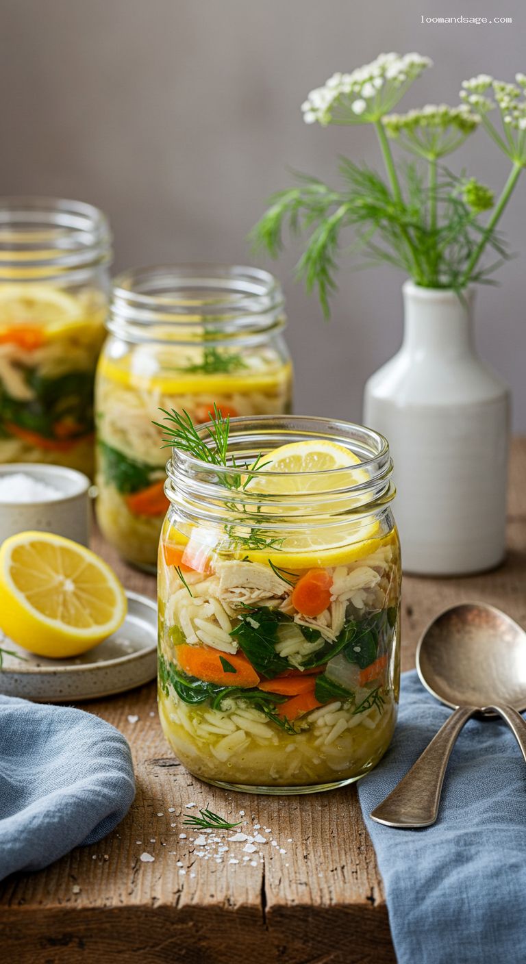 Refrigerate assembled jars up to 4 days. For freezing, store lemon broth separately (up to 2 months) and keep orzo, chicken, and greens in the fridge; combine when reheating to protect textures. Reheat to 165°F. If reheating in the jar, remove the lid and cover loosely; never heat a sealed jar.