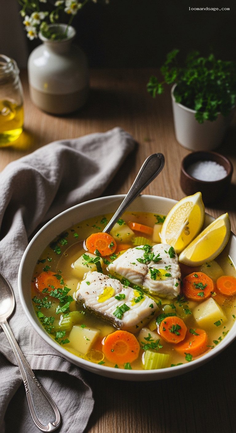 - 6. Return broth and vegetables to the pot to warm. Serve soup in bowls with pieces of fish on top, drizzle with ladolemono, sprinkle with parsley and pepper, and add lemon wedges on the side.