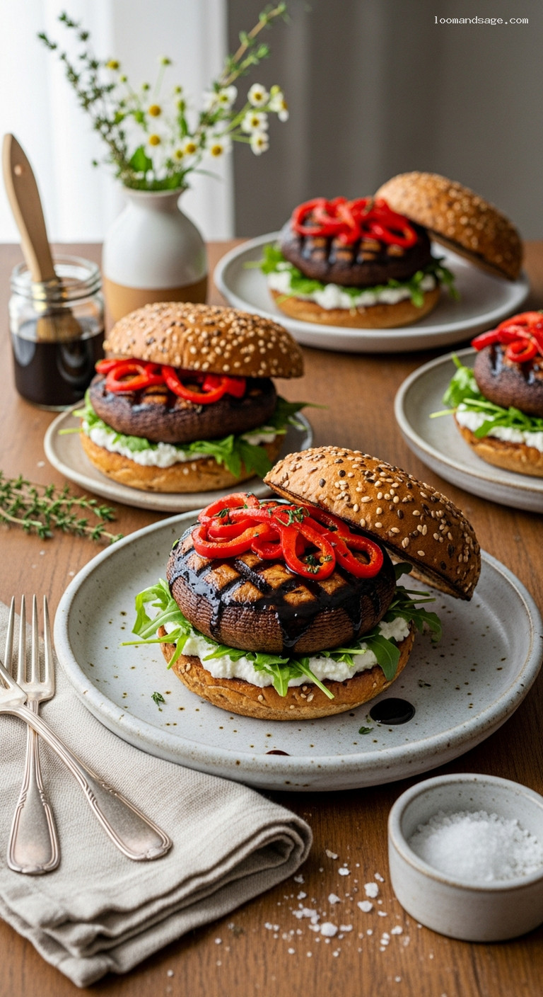Layer the bottom bun with a handful of arugula, add a grilled portobello cap, then pile on roasted red pepper strips. Finish with a pinch of flaky salt, a grind of black pepper, and a few drops of balsamic or glaze if you like. Cap with the top bun and serve immediately while everything is warm and juicy.
