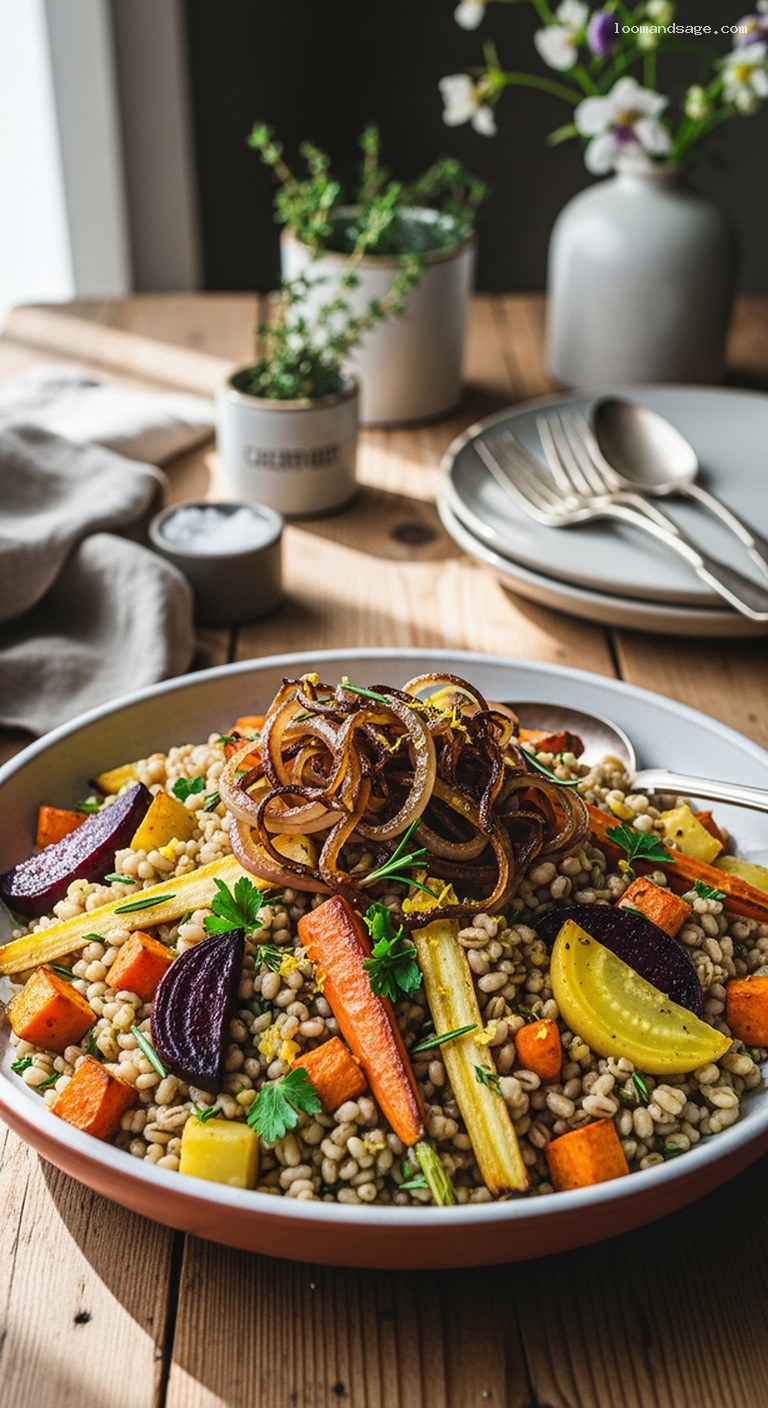 - Different roots and grains: Swap in other root vegetables you love (celery root, turnips, or red beets) or replace some of the barley with farro or brown rice for a mixed-grain pilaf.