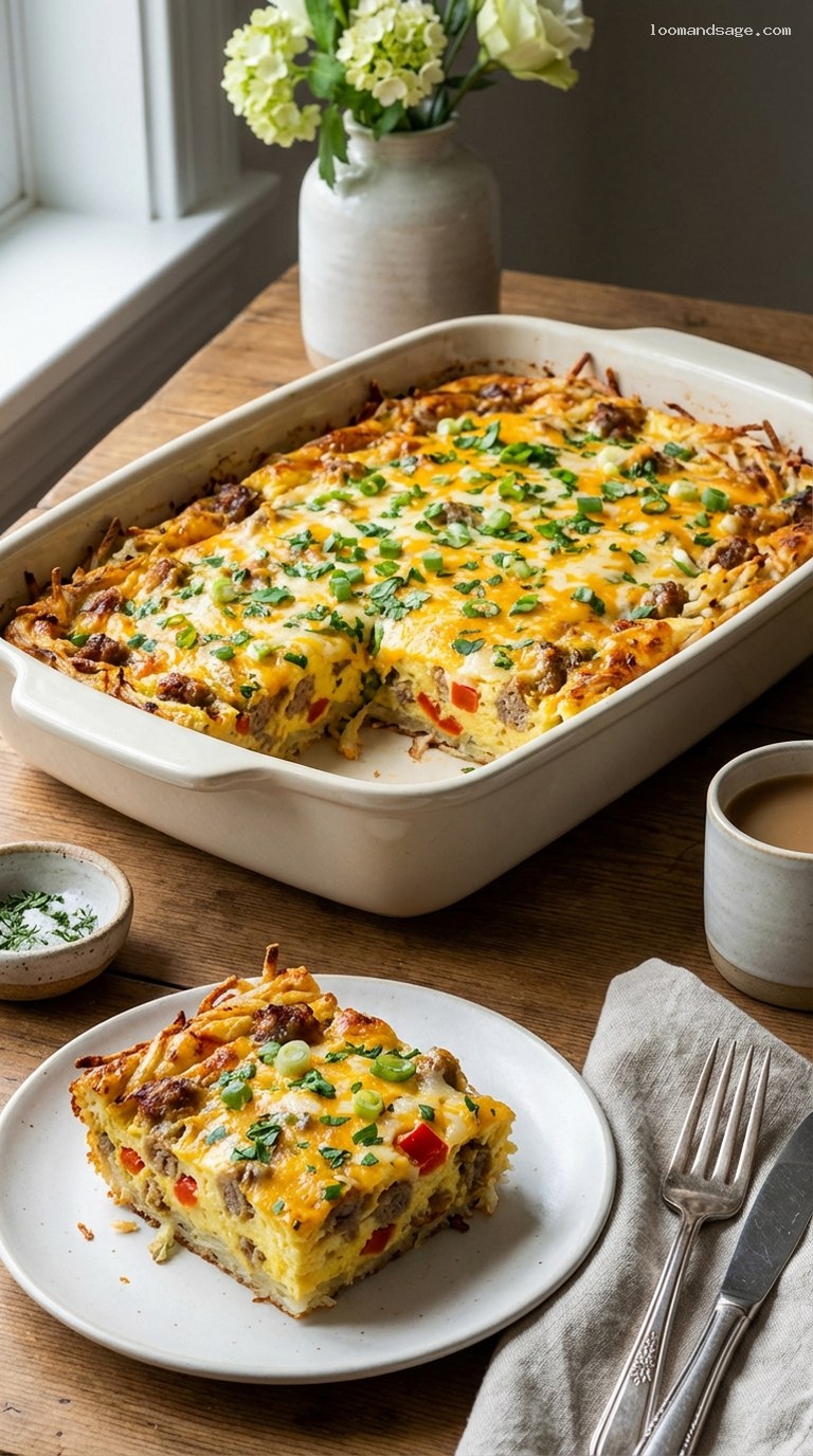 - Classic comfort: Crispy hash browns, savory sausage, and melty cheese baked into a cozy, sliceable breakfast.