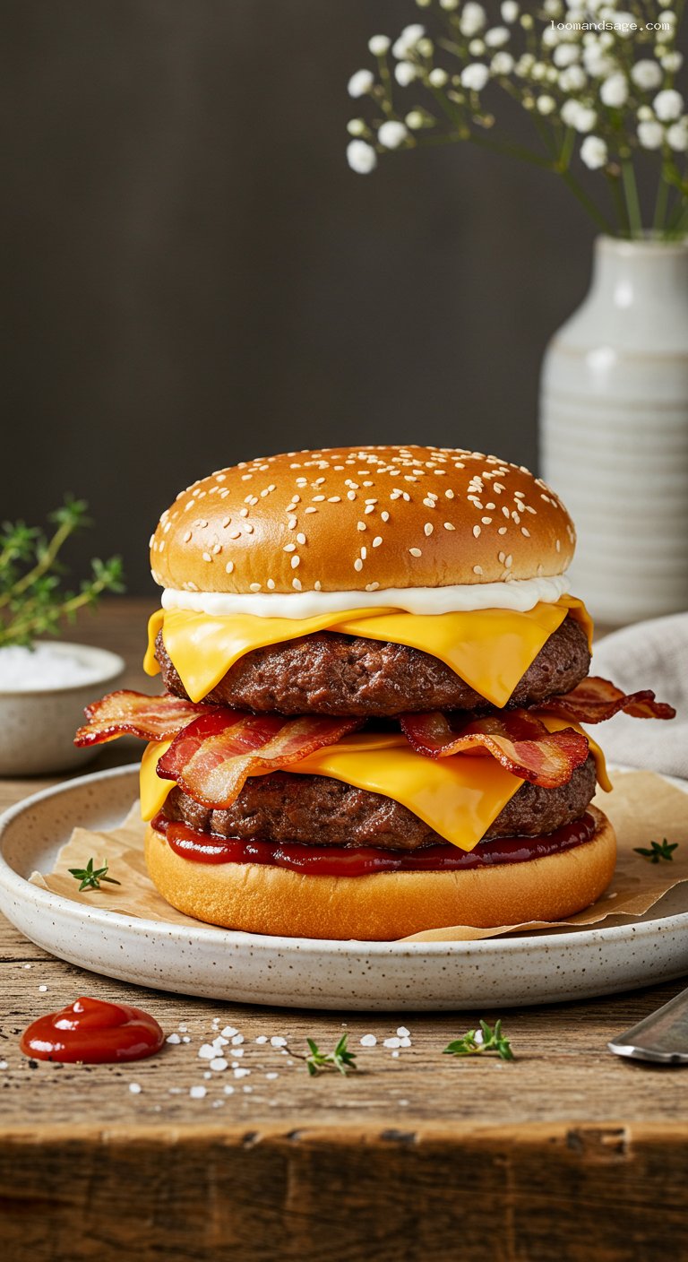 - Pantry: 80/20 ground chuck; thick-cut smoked bacon; sesame seed buns; ketchup; mayonnaise; kosher salt; black pepper; garlic powder (optional); Worcestershire sauce (optional)