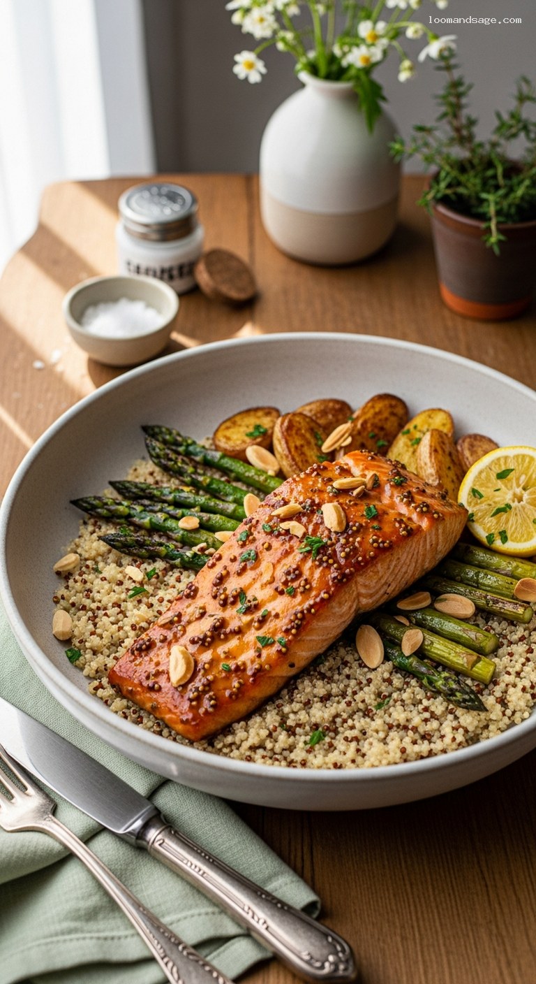 Spoon a fluffy bed of quinoa into warm bowls or plates. Top with a salmon fillet, add asparagus and potatoes, and drizzle with the reserved glaze (kept separate from any raw salmon). Sprinkle with toasted almonds and chopped parsley. Serve immediately with lemon wedges for squeezing.