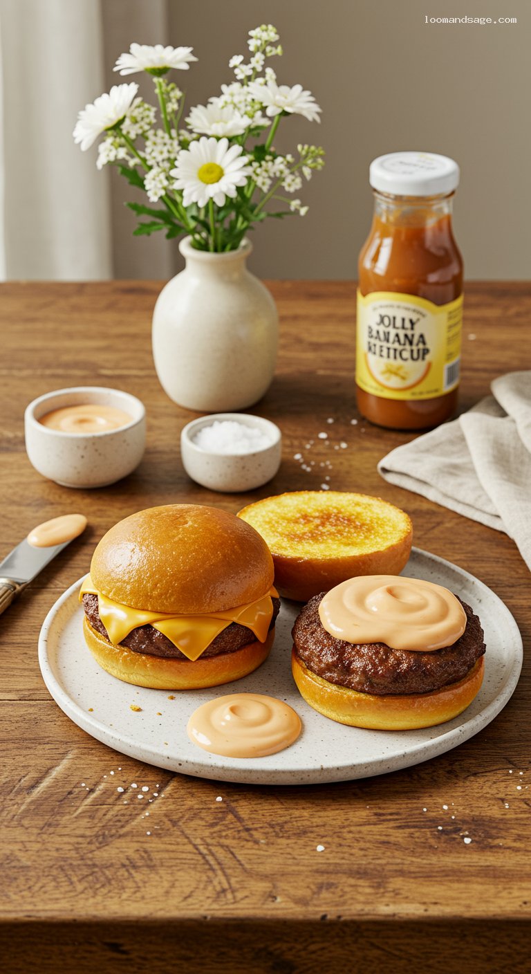 Spread 1–1 1/2 tablespoons Jolly Sauce on the bottom bun and a thin swipe on the top bun. Set a patty on the sauced bun, cap with the top bun, and serve immediately. For that nostalgic soft-bun vibe, wrap each burger in parchment or foil and rest 1–2 minutes to steam before eating.