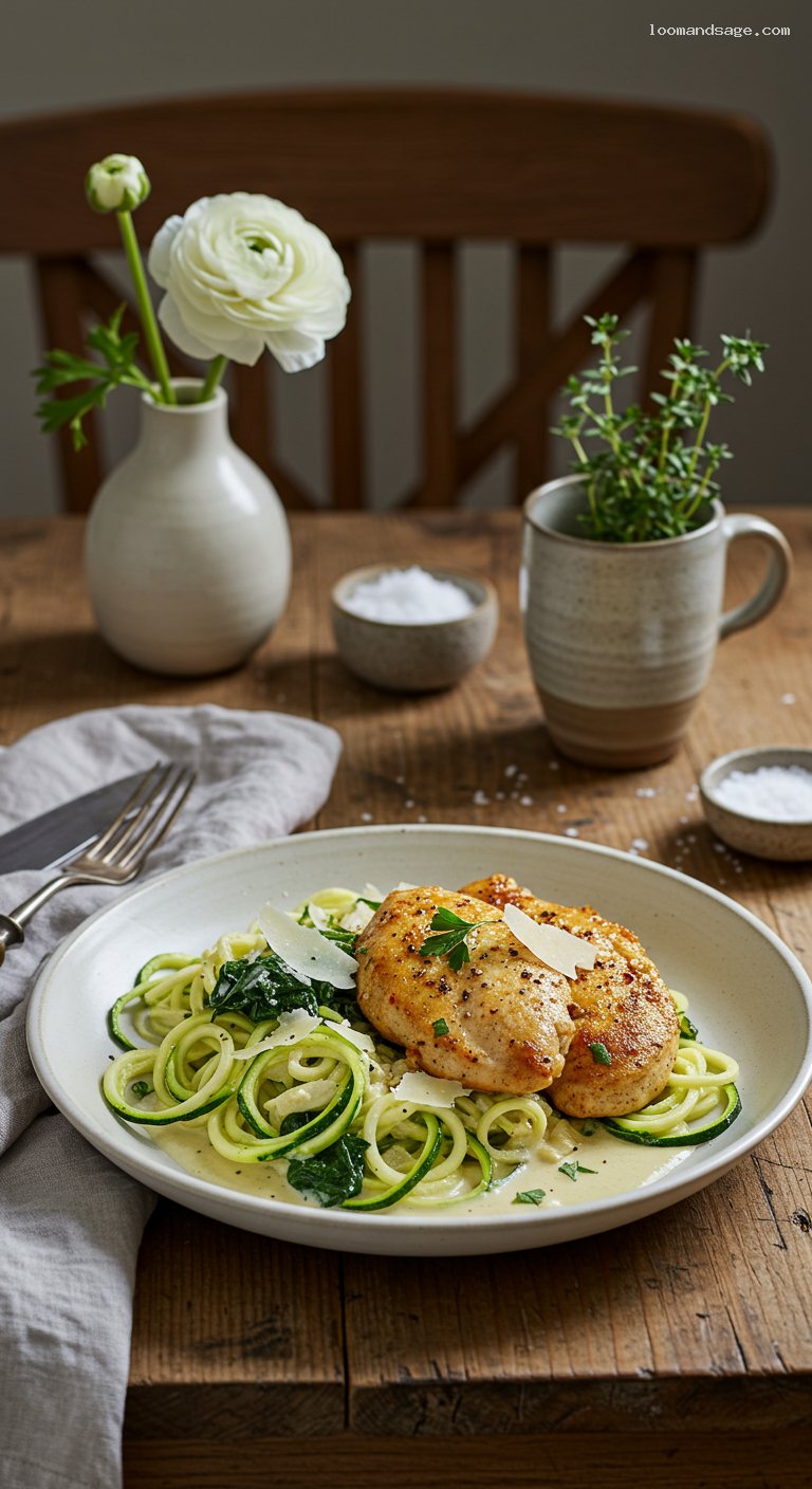 Refrigerate leftovers in airtight containers for up to 3 days. For best texture, store chicken and sauce together and keep zoodles separate (they continue to release moisture). Reheat gently in a skillet over low heat, adding a splash of broth or cream to loosen. You can spiralize zucchini up to 2 days ahead; store wrapped in paper towels in a zip-top bag. Season the chicken in advance and keep covered in the fridge for up to 24 hours.