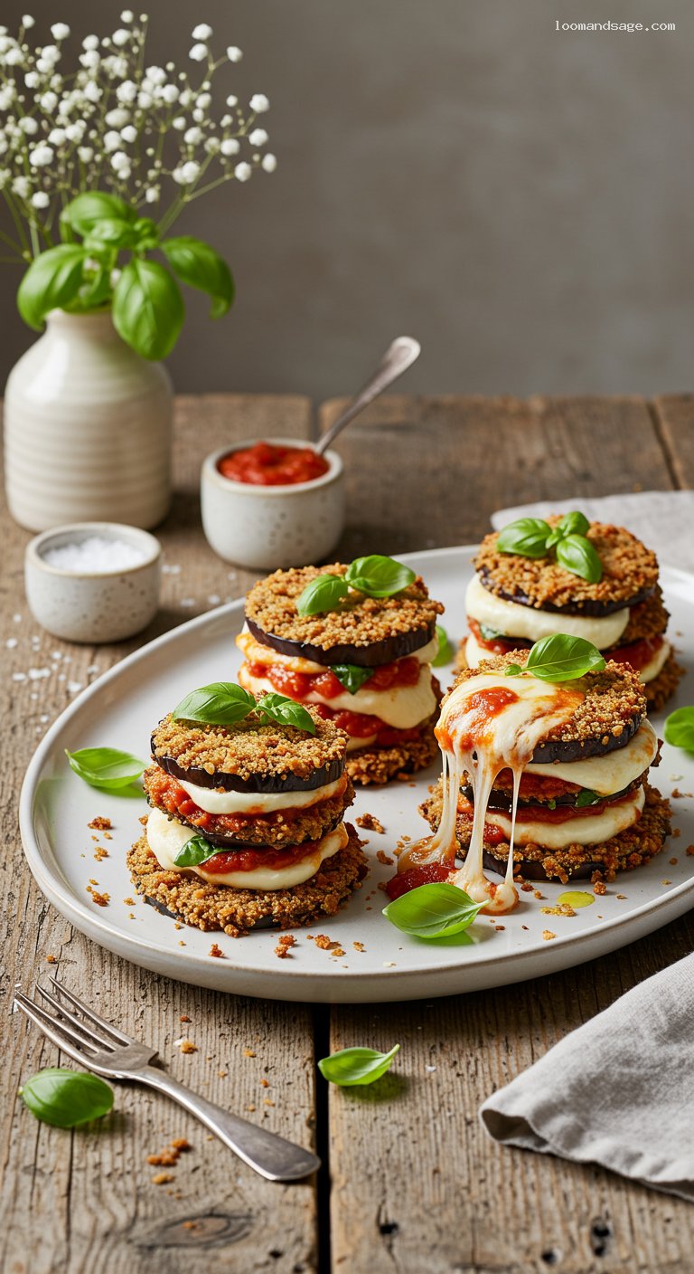 Refrigerate leftovers in an airtight container for up to 3 days. Reheat at 350°F (175°C) for 10–12 minutes until hot, then broil 1 minute to re-crisp. Make-ahead option: Bake the breaded eggplant rounds up to 2 days in advance; cool completely and refrigerate. Assemble and bake just before serving. To freeze, cool baked rounds, freeze in a single layer, then store up to 2 months; reheat from frozen at 400°F (200°C) for 10–12 minutes before stacking.