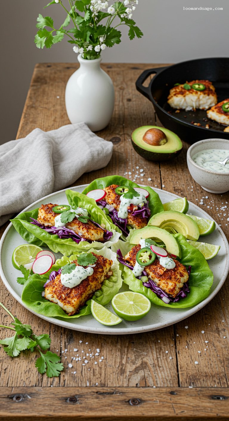 - 6. Build wraps: lettuce, slaw, fish, avocado; drizzle crema. Serve with lime wedges and cilantro.