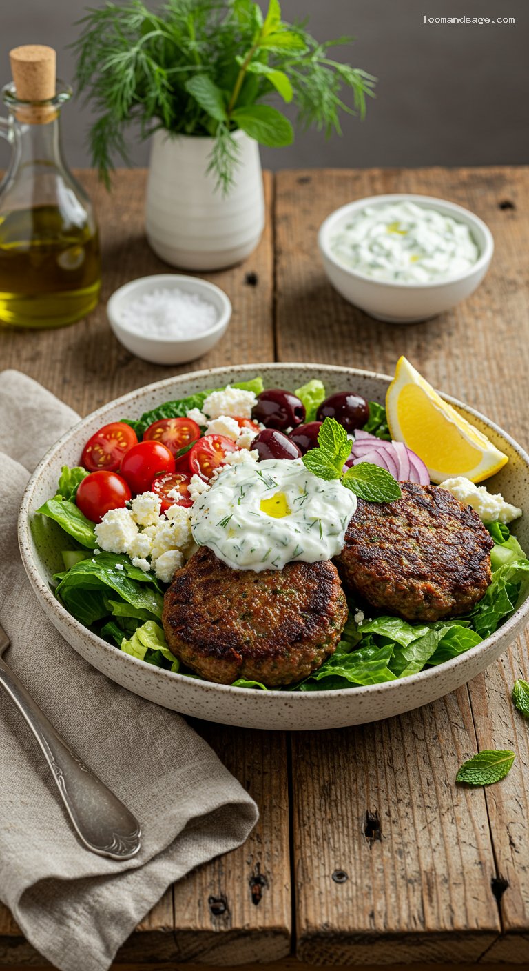 Herby lamb patties with cucumber, tomato, olives, and feta over crisp romaine, drizzled with garlicky tzatziki and finished with a bright squeeze of lemon.