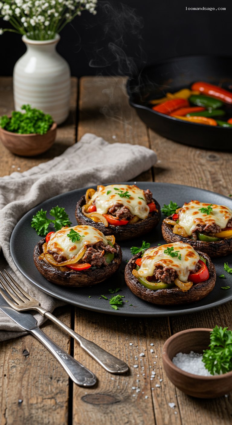 Refrigerate leftovers in an airtight container for up to 3 days. Reheat on a foil-lined sheet at 375°F for 10–12 minutes until hot and the cheese re-melts, or broil 1–2 minutes if you want more browning. Make-ahead: Broil the mushroom caps and cook the cheesesteak filling up to 2 days in advance. Store separately; stuff, top with cheese, and broil just before serving. The filling also freezes well for up to 2 months; thaw overnight in the fridge.