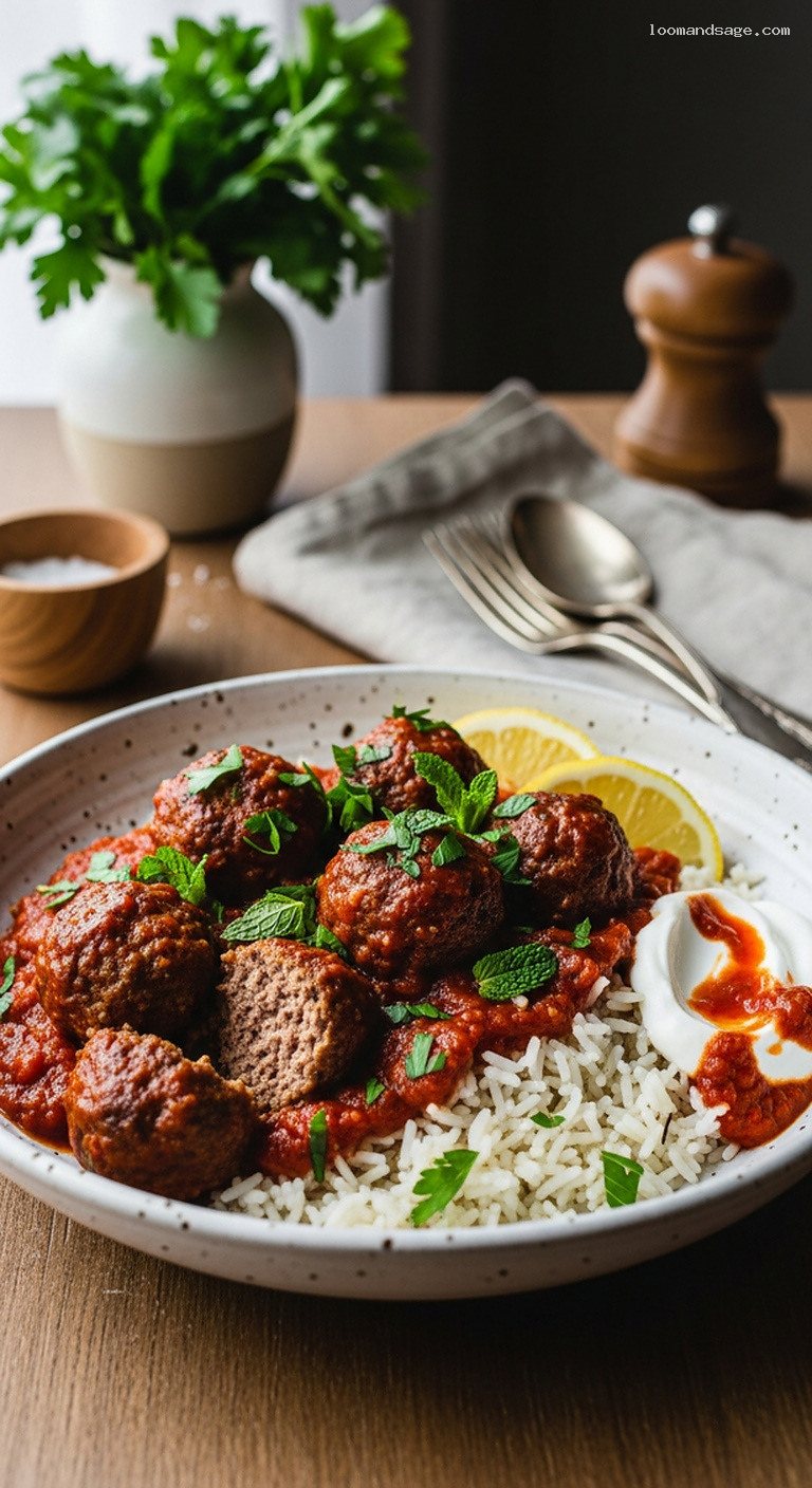 To serve, spoon a bed of fluffy rice into shallow bowls, or place slices of warm crusty bread on plates. Top with generous spoonfuls of the tomato-and-cinnamon sauce and nestle 3–5 kofte meatballs on each portion. Drizzle or dollop with plain yogurt, scatter with chopped parsley and mint, and finish with a squeeze of lemon juice. Serve immediately, with extra sauce and bread on the side for scooping.