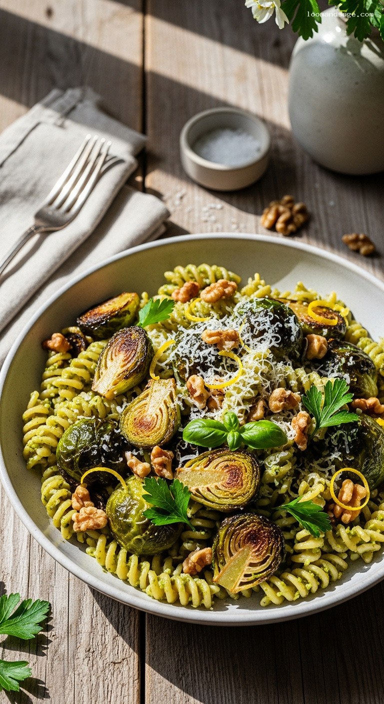 Roasted Brussels sprouts can be cooked a day in advance and chilled in an airtight container; reheat them briefly in a hot oven or skillet to revive their texture before adding to the pasta.