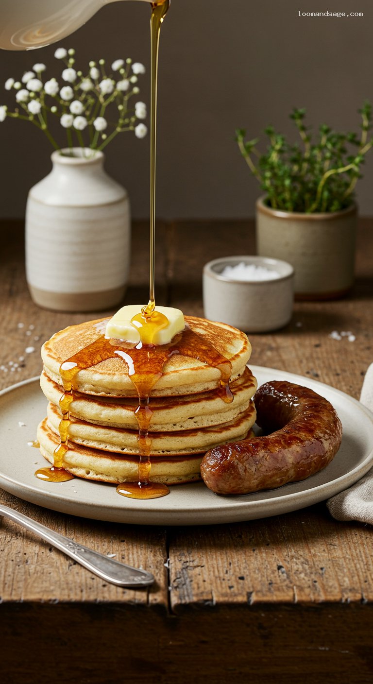 - Pantry: All-purpose flour, cornstarch, granulated sugar, baking powder, baking soda, fine salt, kosher salt, vanilla extract, neutral oil, white vinegar, pancake or maple syrup, ground pork (1 lb), rubbed sage, dried thyme, black pepper, marjoram, garlic powder, ground nutmeg, crushed red pepper flakes, brown sugar