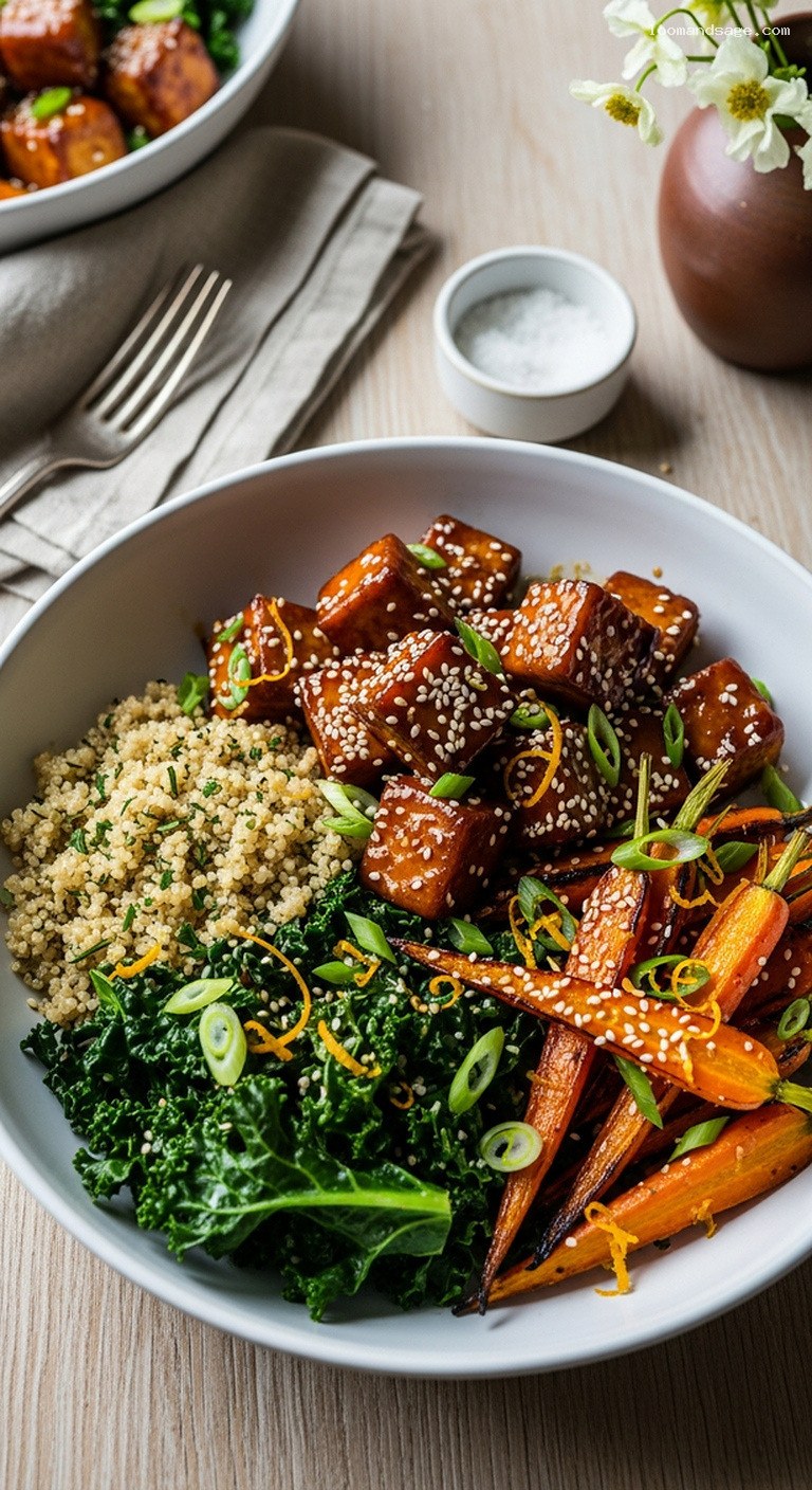 - Balanced bowl: protein-rich tofu, whole-grain quinoa, and plenty of colorful vegetables.