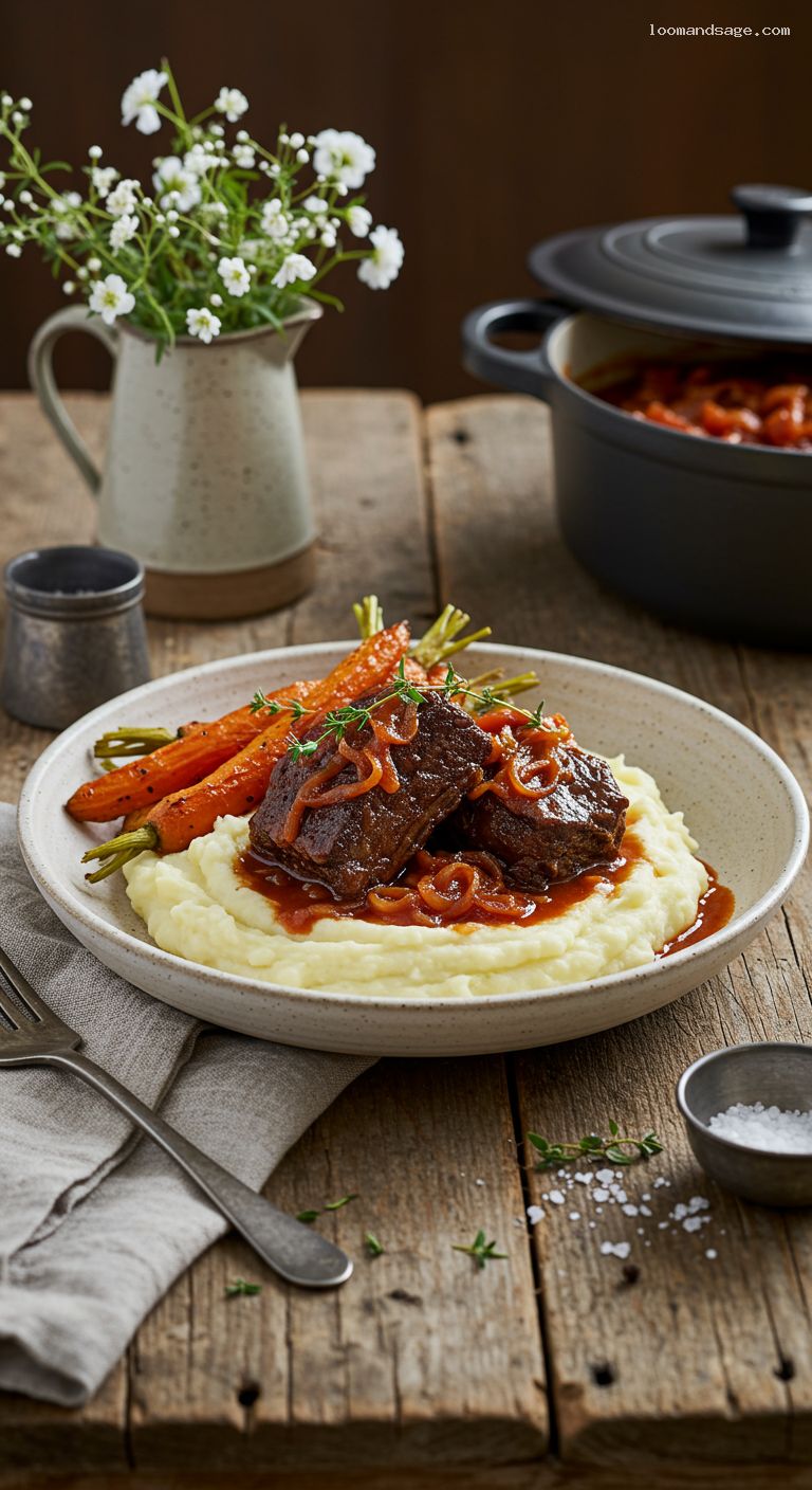 Meanwhile, skim excess fat from the braising liquid. Set the Dutch oven over medium heat and simmer until the sauce is glossy and slightly thickened, 10–15 minutes. Taste and brighten with 1–2 tsp red wine vinegar or balsamic, and adjust salt and pepper. Return ribs to the pot to warm through 2–3 minutes. To serve, spoon a bed of mashed potatoes onto warm plates, top with a rib or two, add roasted carrots, and ladle sauce over the meat and potatoes. Finish with chopped parsley.