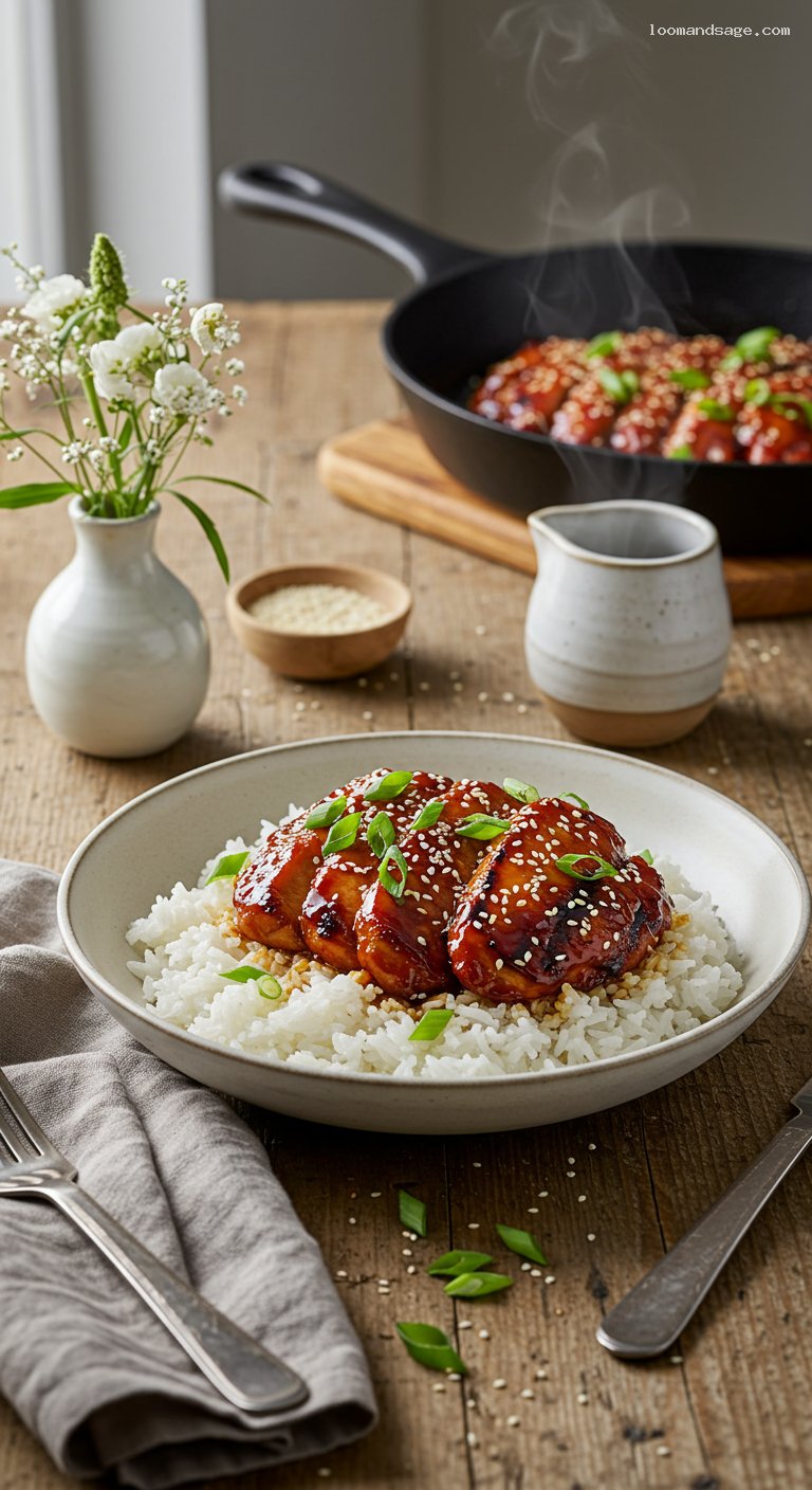 Spoon the glazed chicken over hot jasmine rice. Shower with toasted sesame seeds and sliced scallions. Serve immediately while the sauce is shiny and the rice steamy.