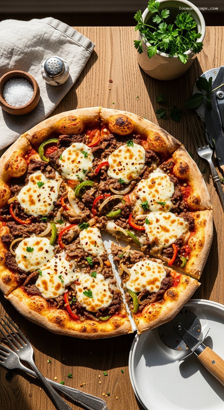 • Spicy Philly Pie: Add sliced hot cherry peppers or pickled jalapeños on top before baking, and finish with a drizzle of hot sauce or chili oil after it comes out of the oven.