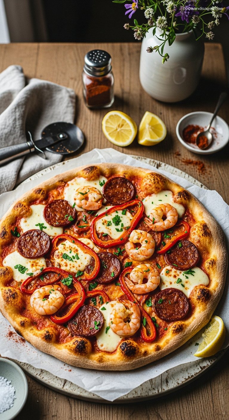 For make-ahead prep, you can slice the chorizo, roast or drain the peppers, and mix the sauce up to 2 days in advance and refrigerate. Prawns can be peeled and deveined a day ahead, kept chilled and covered. If you are using homemade dough, you can cold-proof it in the fridge for up to 24 hours, then bring to room temperature before stretching.