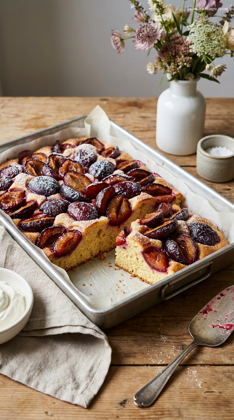 - Cake-style plum kuchen: Instead of yeast dough, use a simple butter cake batter. Cream 1/2 cup (115 g) butter with 3/4 cup (150 g) sugar, beat in 2 eggs and 1 tsp vanilla, then mix in 1 1/2 cups (195 g) flour, 1 1/2 tsp baking powder, 1/4 tsp salt, and 1/2 cup (120 ml) milk. Spread in the pan, top with plums as directed, and bake 30–35 minutes.