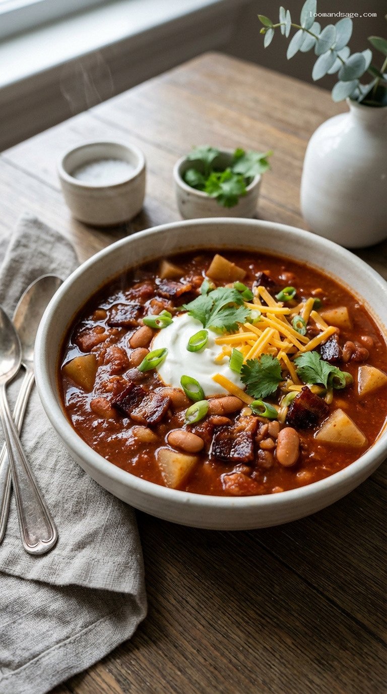 Ladle the hot chili into bowls. Top each serving with a spoonful of sour cream or Greek yogurt, a handful of shredded cheese, and a sprinkle of the reserved crispy bacon. Add sliced green onions, chopped cilantro, and a squeeze of lime if you like a brighter finish. Serve with tortilla chips, cornbread, or crusty bread alongside. This chili thickens as it cools, so if you reheat leftovers, you may want to stir in a splash of water or broth to loosen it slightly.